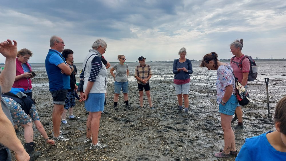 Am Treffpunkt in Harlesiel hatten wir kurz Gelegenheit, uns mit unserem Bundestagsabgeordneten Julian Pahlke über die aktuellen Themen auf der Otfriesischen Halbinsel auszutauschen. Dabei ging es vor allem um die staatliche Beteiligung an der Meyerwerft und die umstrittenen Gasbohrungen im Wattenmeer vor Borkum. Zur Wattwanderung mit Wattführerin Imke starteten 17 Erwachsene und sieben Kinder.