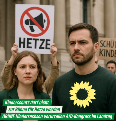 Hannover, 16.06.2025 – Am kommenden Samstag plant die AfD-Landtagsfraktion Niedersachsen einen sogenannten "Kinderschutzkongress" im Landtagsgebäude. Die Landesvorsitzenden von BÜNDNIS 90/DIE GRÜNEN Niedersachsen, Greta Garlichs und Maximilian Strautmann, stellen sich gegen die Instrumentalisierung des Kinderschutzes für rechte Narrative und rufen zur Teilnahme an der Gegendemonstration um 9 Uhr vor dem Landtagsgebäude auf.