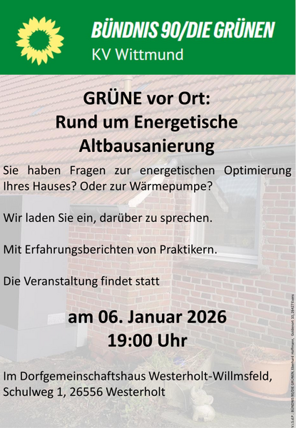 Nach erfolgreichem Start der Veranstaltungsserie im November treffen wir uns erneut zum Thema "Energetische Sanierung von Altbauten", diesmal in Westerholt-Willmsfeld.