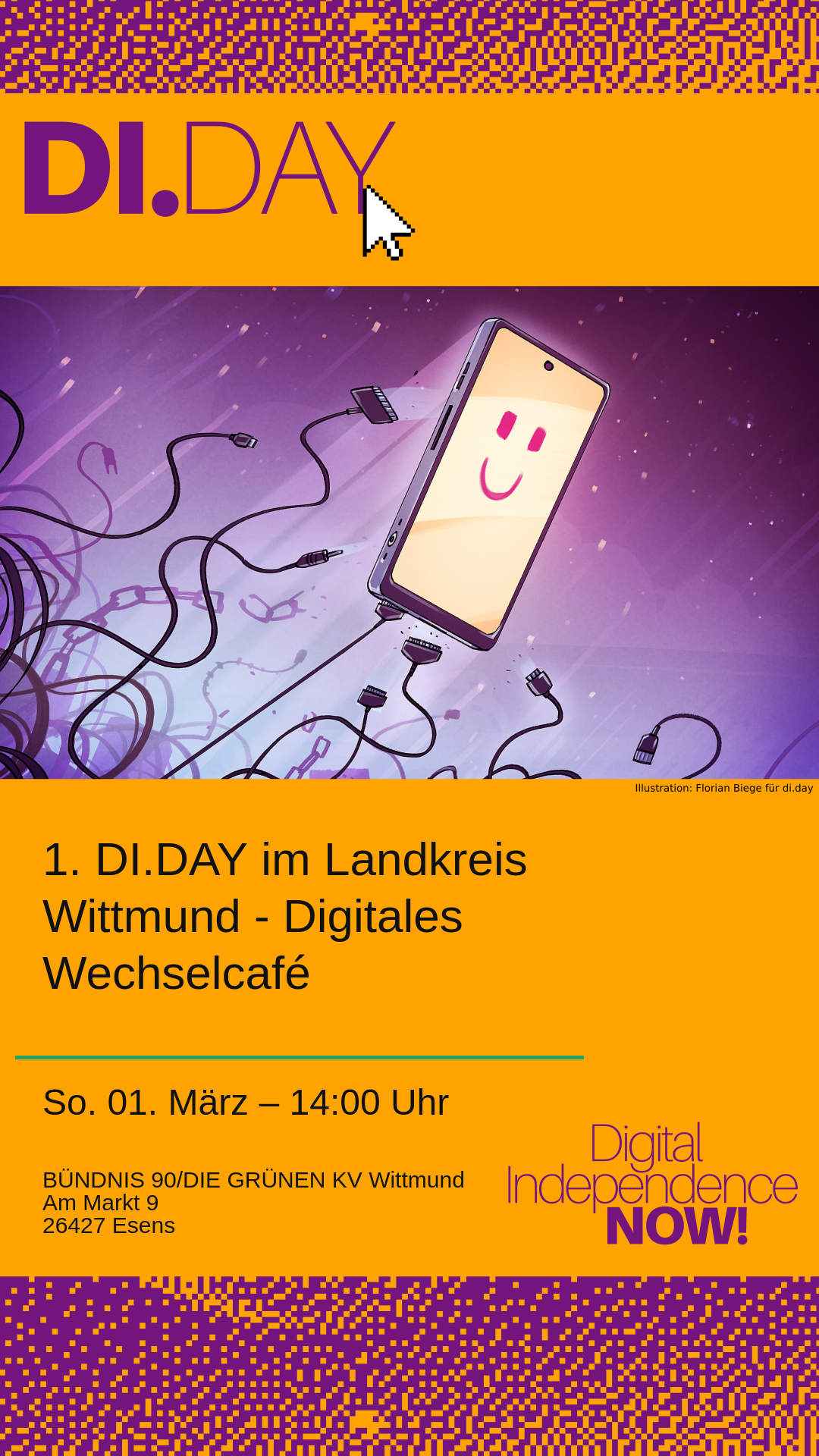 "Am ersten Sonntag im März zeigen wir (Die Grünen im LK Wittmund) dir (Einwohner:in des LK Wittmund) Auswege aus der Abhängigkeit von den US-Big-Tech-Konzernen.